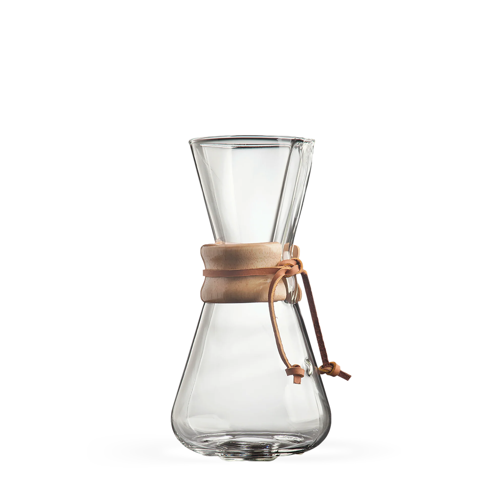 The Chemex coffeemaker is a paper-filter brewing device that creates an exceptionally clean cup of coffee. With a full glass body and a polished wood collar with leather tie - it's elegant simplicity personified. We have have 4 sizes available - 3, 6, 8 and 10 cups.