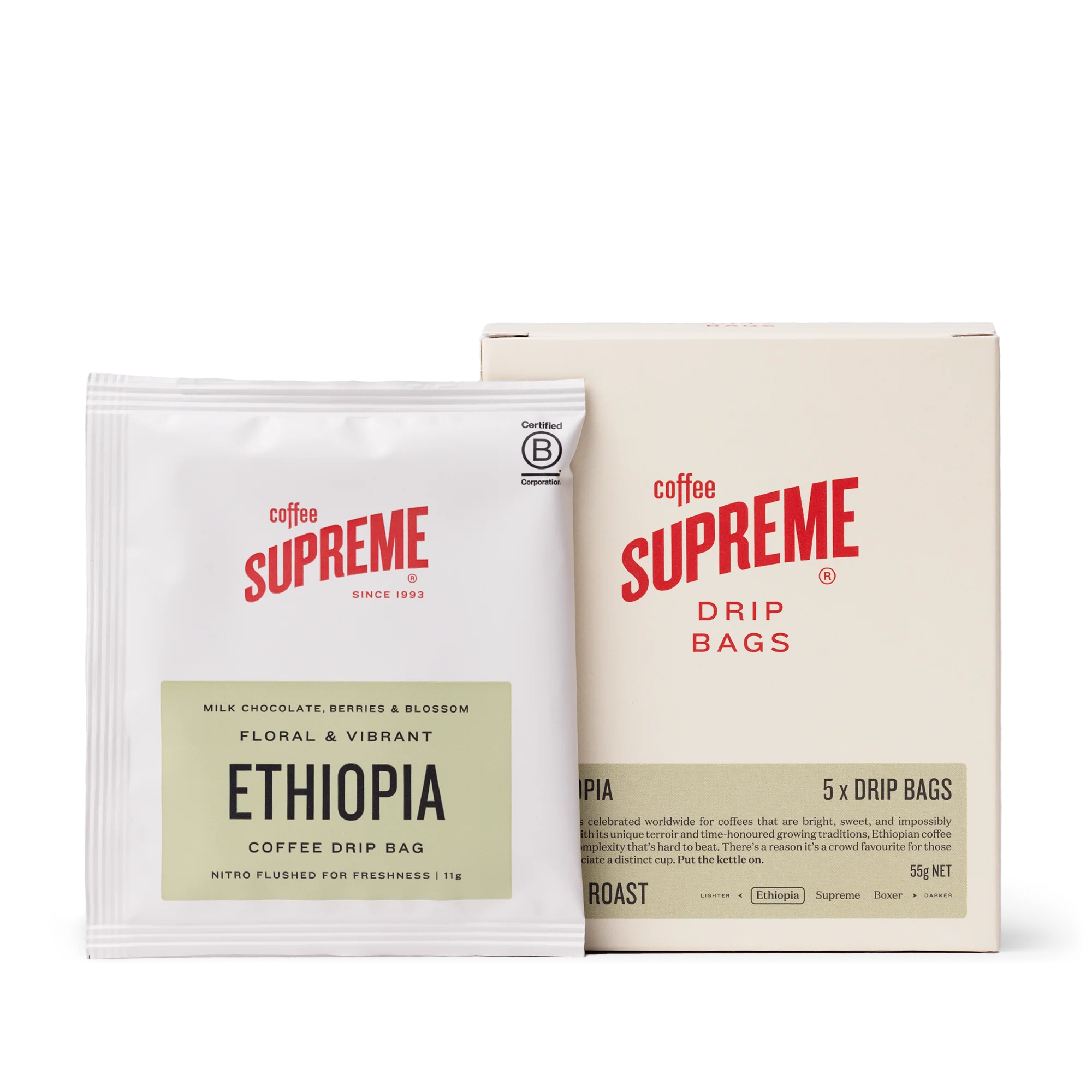 Coffee Supreme Drip Bags are ground perfect, pre-portioned, compostable, and nitro-flushed to preserve coffee freshness. Designed to produce a great cup of coffee on the move or simplify your morning routine, these Drip Bags make brewing high-quality coffee effortless. No need to pore over this pour-over. It’s good coffee, real easy.