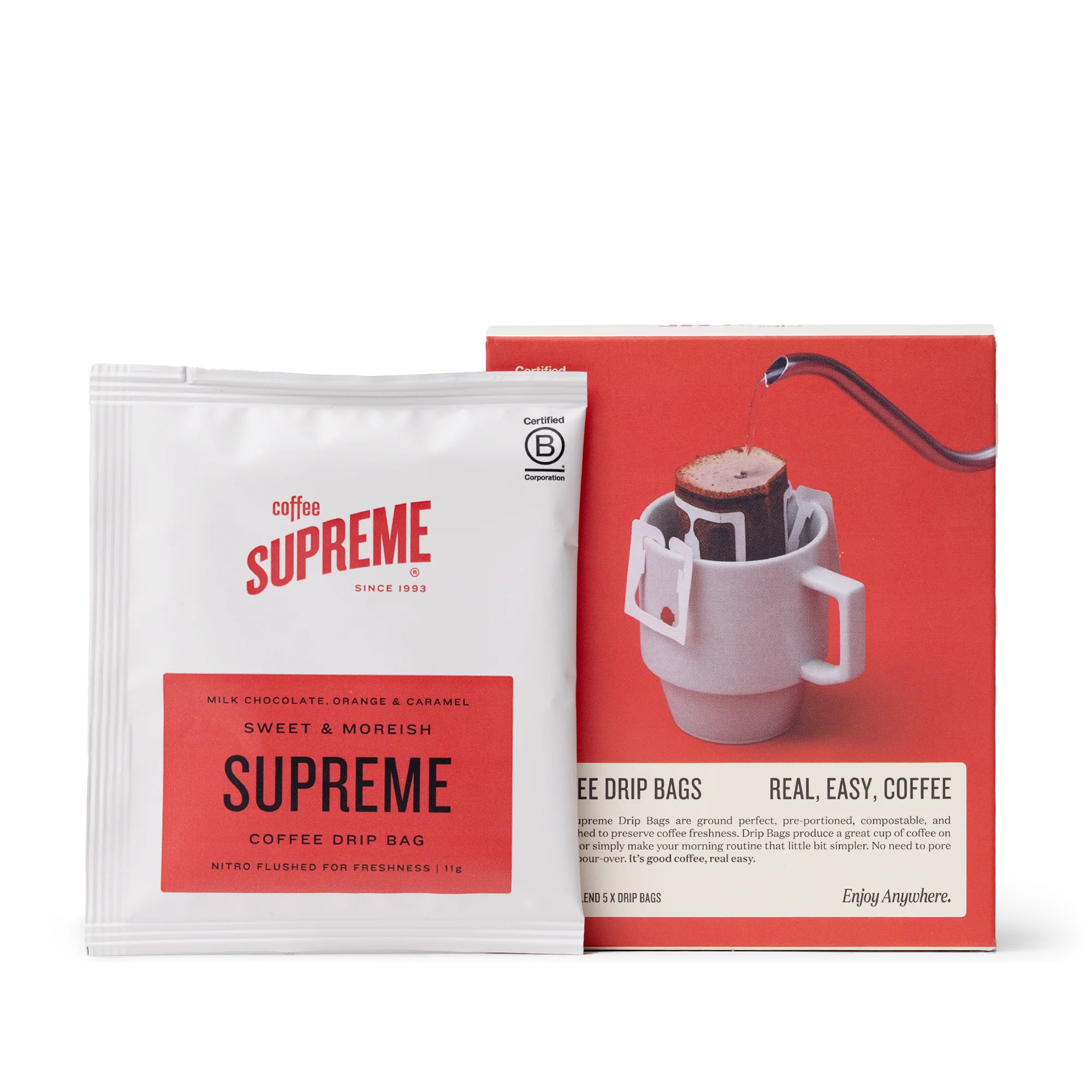 Supreme Blend is a coffee so good, we gave it our name. It's sweet, it's rich, and it’ll have you reaching for another cup. Perfectly crafted for a drip bag, it's designed for everyone. Brewed and enjoyed nationwide, from cafe counters to kitchen benches, Supreme delivers every time.